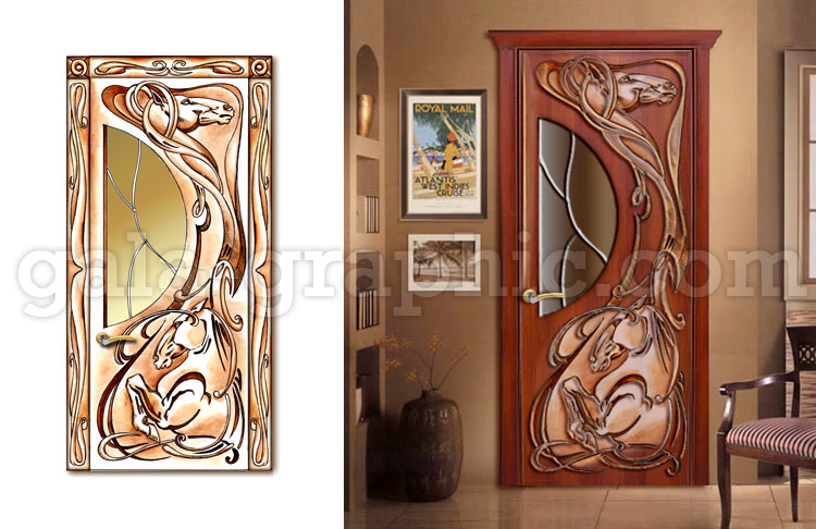 | Эскиз резьбы по дереву для межкомнатной / входной двери "Лошади", 2009г. |